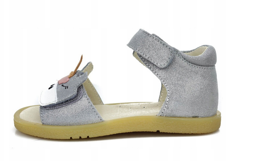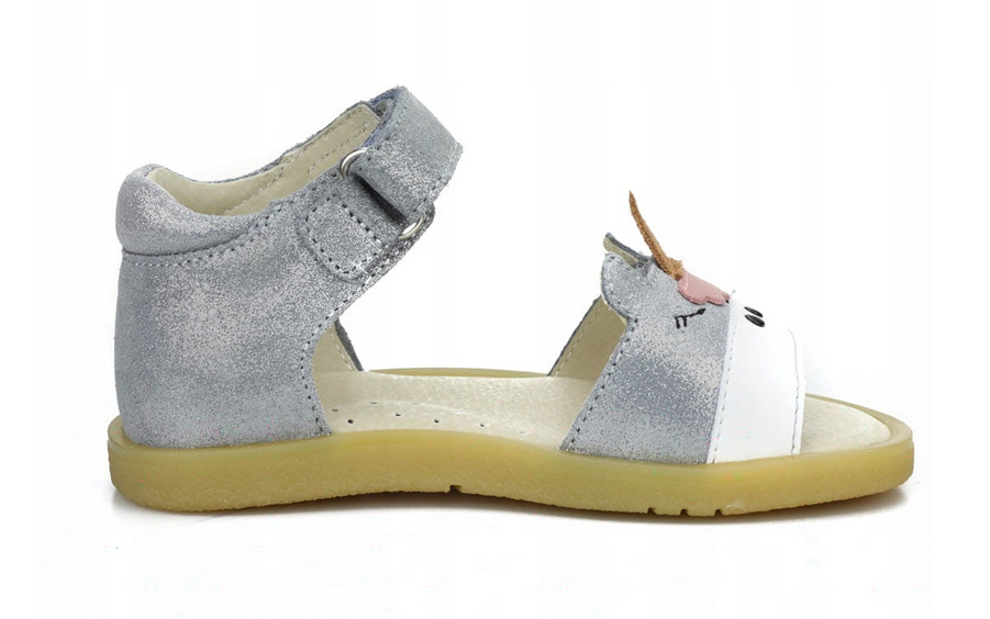 Przepiękne sandałki polskiego producenta obuwia dla dzieci Mido. Buty dla dziewczynek z unikatowym wzorem jednorożca w kolorze szarym z połyskiem. W całości wykonane ze skóry naturalnej. Buciki mają usztywniony zapiętek, który stabilizuje piętę. Jednocześnie przestrzeń palcowa pozostawia sporo miejsca na swobodne ruchy palcami malucha, a cała podeszwa jest bardzo elastyczna. Sandałki zapinane są na rzepy, co ułatwia dopasowanie buta do nóżki dziecka.