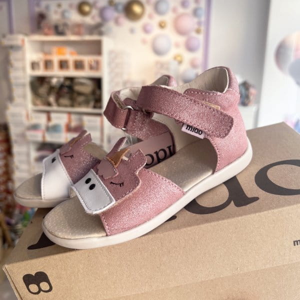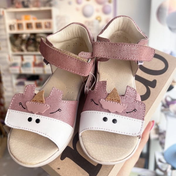 Przepiękne sandałki polskiego producenta obuwia dla dzieci Mido. Buty dla dziewczynek z unikatowym wzorem jednorożca w kolorze połyskującego różu. W całości wykonane ze skóry naturalnej. Buciki mają usztywniony zapiętek, który stabilizuje piętę. Jednocześnie przestrzeń palcowa pozostawia sporo miejsca na swobodne ruchy palcami malucha, a cała podeszwa jest bardzo elastyczna. Sandałki zapinane są na rzepy, co ułatwia dopasowanie buta do nóżki dziecka.