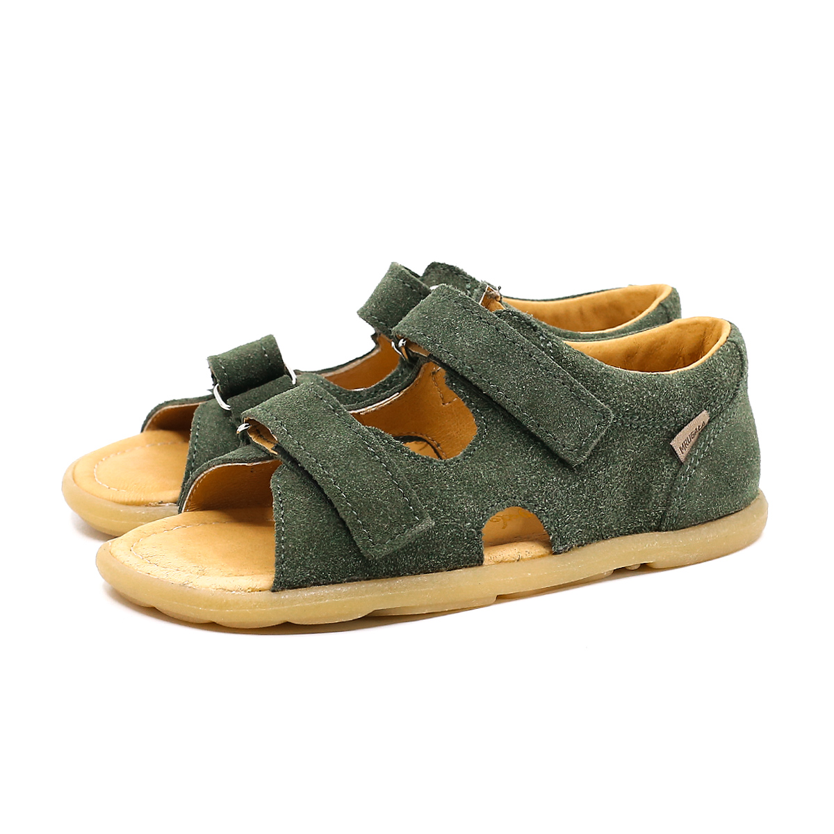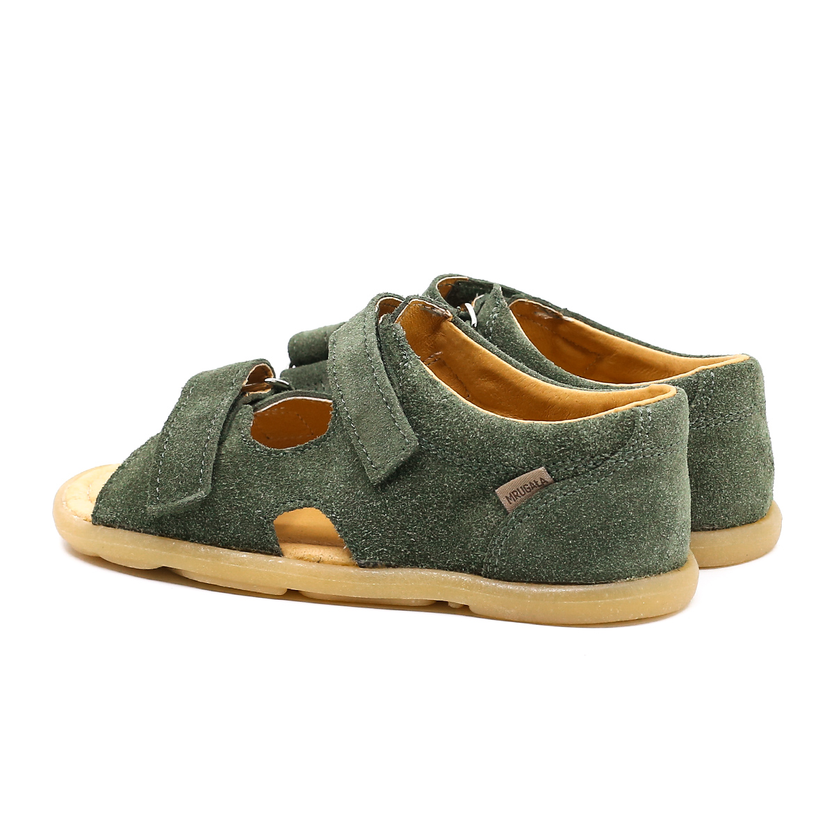Sandały dziecięce Mrugała z kolekcji lato 2026 to doskonały wybór na ciepłe, pełne ruchu dni. Model z odkrytymi palcami został wykonany z miękkiej skóry welurowej w stonowanym, oliwkowym kolorze, dzięki czemu świetnie sprawdzi się zarówno na co dzień, jak i podczas wakacyjnych wycieczek.
