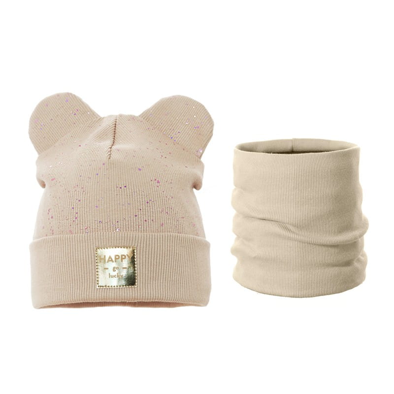 Czapka Miś dla dziewczynki, błyszcząca i mięciutka z kominem na chłodniejsze, wiosenne dni.