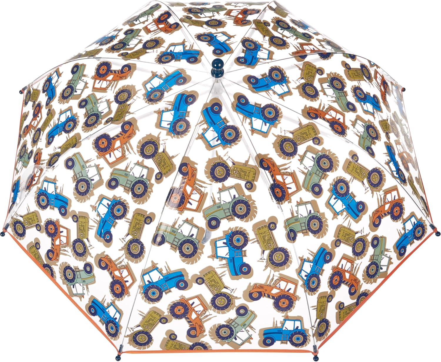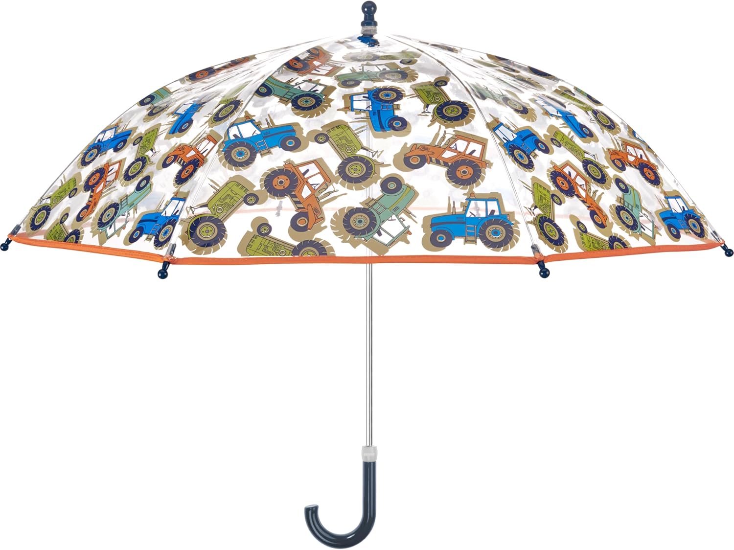 Przezroczysta parasolka w kolorowe traktory spodoba się każdemu fanowi motoryzacji. Idealnie sprawdzi się na spacerach w deszczowe dni.