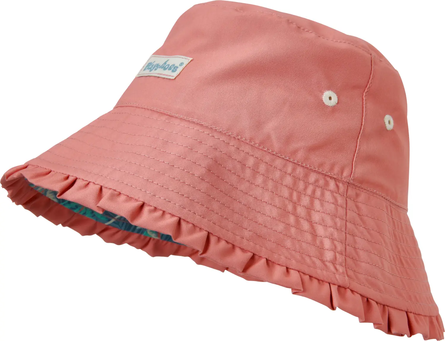 Kapelusz chroni przed szkodliwym promieniowaniem słońca oraz zachwyca swoją kolorystyką, ponieważ jest dwustronny:) Z jednej strony mamy kolorowe palmy, druga strona jest całkowicie gładka - morelowa. Kapelusz wykończony jest uroczą falbanką.